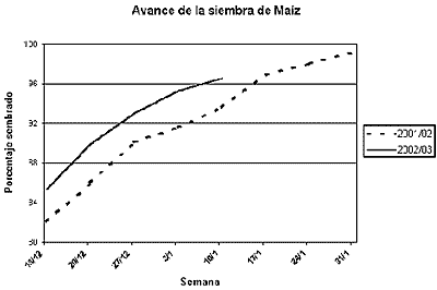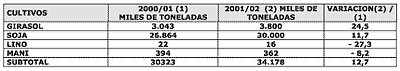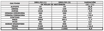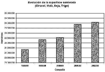 Para la campaña 2002/03, los cultivos oleaginosos (sobre todo, soja y girasol) incrementarán la superficie sembrada alrededor de un 9 % en relación al año agrícola anterior, impulsados por los favorables precios del mercado. Asimismo, todo el complejo oleaginoso representa el 56 % del área sembrada total en el país, avanzando un 5 % sobre el año anterior en el que representaba el 51 % . Los productores de soja concretarán la mayor área sembrada de la historia en el país. Las estimaciones de cobertura indican un incremento importante del área, que supera el 8 % en relación a la anterior campaña. Esto nos indica que la superficie sembrada se aproximaría a las 12.600.000 hectáreas. Para el girasol el incremento de superficie sembrada supera el 15 %, ubicándose en las 2,37 millones de hectáreas. Esta suba en la cobertura se basa fundamentalmente en la atracción que ejerció el precio del producto a época de cosecha.