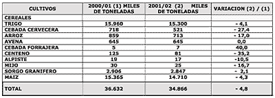 En los cultivos cerealeros, para el maíz, se prevé una disminución de 1,7 puntos porcentuales inferiores al área anterior, previéndose implantar 3.011.000 hectáreas (grano y forraje). Se estima que la superficie que se dedicará a cosecha de grano rondará las 2.360.000 hectáreas, dedicándose a forraje las 650.000 restantes. En el país se ha implantado el 97 % del área estimada inicialmente, restando la cobertura de los maíces tardíos que se concretan usualmente en la zona del norte de Santa Fe y en el NEA y NOA. De acuerdo a esta área sembrada, al comportamiento de las condiciones climáticas futuras y al estado de desarrollo que muestran los cultivos en las distintas zonas, se está estimando una producción para esta campaña que oscilaría entre 13,5 y 14,5 millones de toneladas. El sorgo granífero denota es esta campaña una pequeña recuperación en el área dedicada a su siembra. Para este año se prevé una cobertura de 606.000 hectáreas, lo que representa un incremento de 2,4 puntos porcentuales en relación al año anterior. El trigo tendrá un área cubierta de 6,15 millones de hectáreas. Gran parte de la superficie que no se implantó con este cultivo, se dedicó a soja de primera implantación. Las dificultades climáticas que afectaron distintas zonas productivas, permiten pronosticar una disminución en el área a cosechar, la que de no mediar circunstancias agravantes, se ubicará en las 5.900.000 has.
