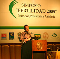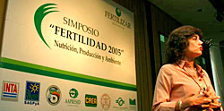 Los ingenieros agrónomos Luis Ventimiglia del UEEA INTA 9 de Julio; María Marino de la EEA INTA Balcarce (foto) y Héctor Sánchez del EEA INTA Famaillá, Tucumán, participaron del panel "Novedades en el manejo de la fertilidad de suelos y fertilización de cultivos en Argentina" en el marco del Simposio Fertilidad 2005 que se desarrolló en la Bolsa de Comercio de Rosario.El Ing. Ventimiglia destacó en su exposición sobre la Nutrición de cultivos en el centro de Buenos Aires, que la zona sufre un balance negativo de nutrientes y que para que dicha situación cambie "es importante incrementar la fertilización de los cultivos en la región, apuntando fundamentalmente a mejorar la nutrición de los mismos y a restablecer los niveles de fertilidad edáfica, hasta hacerlos compatibles con los sistemas de producción agrícola-ganaderos sustentables". Asimismo Ventimiglia comentó que en los últimos 20 años la superficie destinada a la agricultura creció un 20 por ciento, lo que lleva a que hoy en día la superficie se ubique en unas 880.000 hectáreas. En ese mismo período se pasó de una utilización mínima de fertilizantes a un uso mayor de los mismos, alcanzando en trigo el 92 por ciento. A pesar de este considerable aumento, el balance negativo se ha incrementado. "Esto fue motivado por una mayor superficie agrícola y por la obtención de mayores rendimientos", dijo Ventimiglia. "Es indispensable que la incorporación de tecnologías en el manejo de la fertilidad de los cultivos que se hacen en la zona, esté basada en investigaciones objetivas realizadas en condiciones reales de producción", concluyó. En cuanto al "Abastecimiento de fósforo y de nitrógeno en pasturas: claves para una ganadería productiva y sustentable", la Ing. Agr. María Alejandra Marino, explicó que "el momento de aplicación de los fertilizantes debe determinarse tratando de reducir los desbalances entre la oferta de nutrientes del ambiente y los requerimientos nutricionales de las pasturas". Y agregó: "Aunque las fertilizaciones nitrogenadas a fin de invierno permiten obtener las mayores eficiencias de uso de Nitrógeno aplicado, las fertilizaciones otoñales pueden ser utilizadas por tener valor estratégico en aquellos planteos productivos en los que es necesario cubrir períodos de escasez en la oferta de forraje. La fertilización con Potasio y además con Nitrógeno, permite incrementar las tasas de crecimiento y adelantar el momento de utilización de los recursos, lo que resulta particularmente beneficioso a fines de invierno. Por su parte, el Ing. Agr. Héctor Sánchez brindó una explicación detallada de la "Fertilización de soja y maíz en el noroeste argentino" y aseguró que la región del noroeste "sufre diferentes condiciones edafo-climáticas". Asimismo comentó que las principales deficiencias nutricionales de la región son el Nitrógeno y el Potasio y que "no se encontró respuesta al agregado de S, salvo nichos muy puntuales". Por último sugirió a los productores "usar Potasio pensando en un esquema de rotación de al menos tres cultivos, aprovechando su residualidad" y "ser cuidadosos en el uso de Azufre y considerar su uso en esquemas de alta producción como un elemento para una fertilización más balanceada y también en aquellos suelos de origen aluvional enriquecidos texturalmente en arena". Un 35 por ciento del mercado mundial se abastece con maíz norteamericano