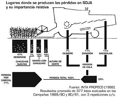 Los lugares donde se producen las pérdidas en Soja y su importancia relativa (Ver Gráfico), son aquellos, en promedio, donde después de muchas determinaciones realizadas por técnicos del INTA en diversas regiones del país, se produce la mayor cantidad de pérdidas en cosecha. Por eso es importante identificar en qué lugar se están produciendo y corregirlas para no tener un dolor de cabeza con pérdida de rendimiento (como lo señalan los Proyectos Propeco 1992 y Precop 2005 del INTA). Rendimiento que ya está logrado,